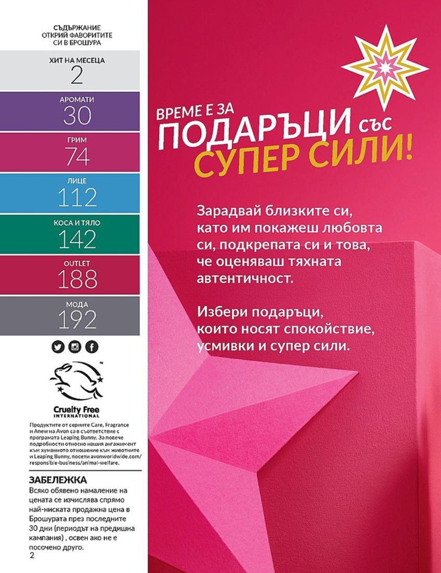 Добре дошли в Tiendeo, идеалното място за намиране на най-добрите оферти, каталози и промоции на Козметика в България. През месец декември 2025 в Tiendeo ще имате достъп до най-новите предложения и отстъпки на Avon, една от най-признатите марки в сектора на Козметика.